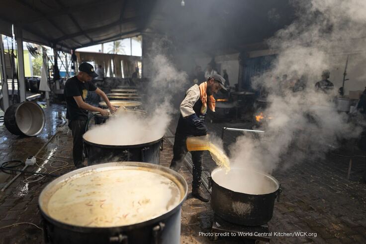 ガザの人々に配る、温かい食事を作っているキッチンの風景です。