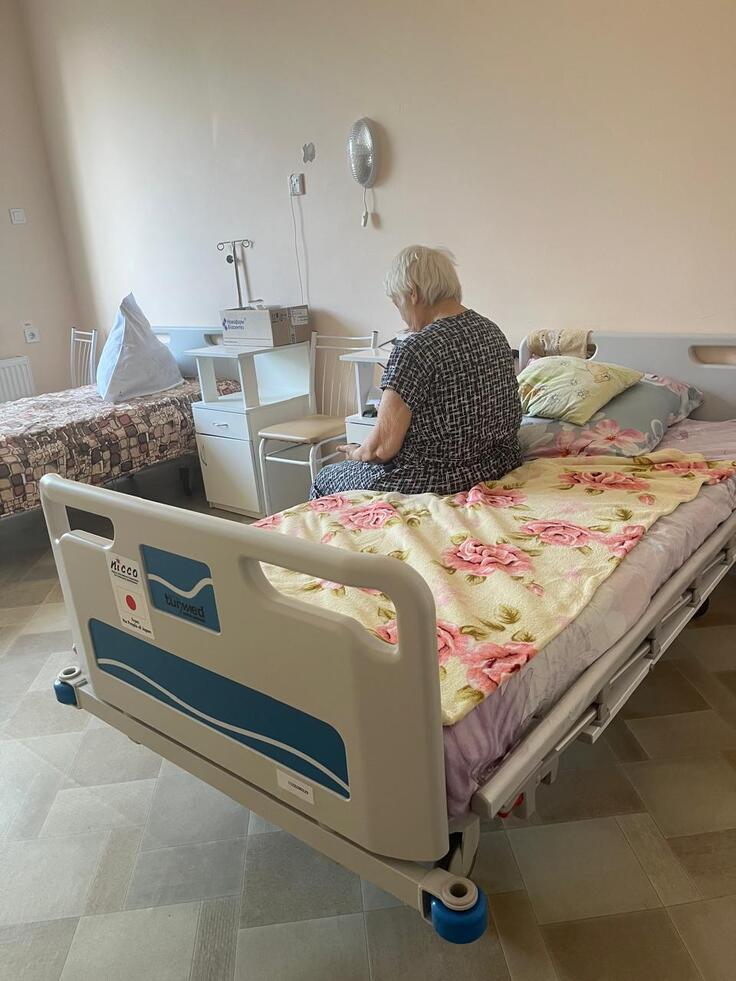 支援によって供与されたベッドと寝具です(ベッドにNICCOマークが貼られています)。ベッドはこれまでよりサイズが大きく、ゆっくり体を休めることができます。また、キャスター付きで移動も可能です。患者さんからは、「清潔な寝具が用意されていることに驚いた。おかげで入院生活を快適に過ごすことができた」という感想を頂いています。