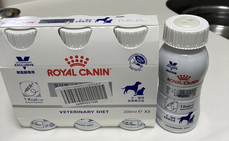 経鼻チューブからあげられるごはんも限られており、ロイヤルカナンのクオリティリキッドのみを与えています。1本約¥850円。1日1本です。