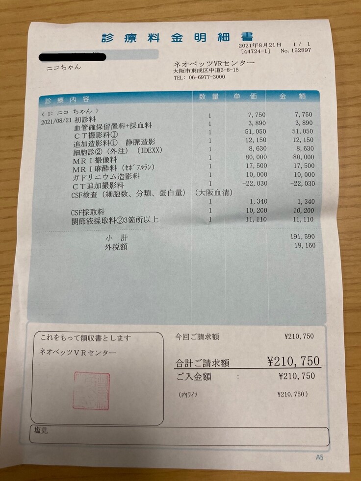 下記は8/21にCT、MRI検査をした際の領収書です。