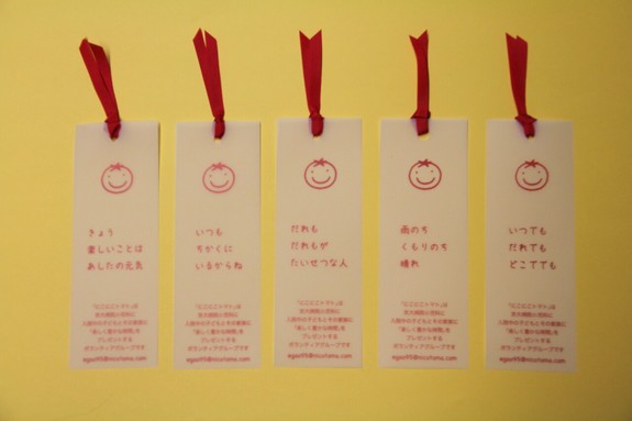 厚手のトレーシングぺーパーでできています。にこトマの活動で、日ごろ大事にしている「ことば」が書かれています。