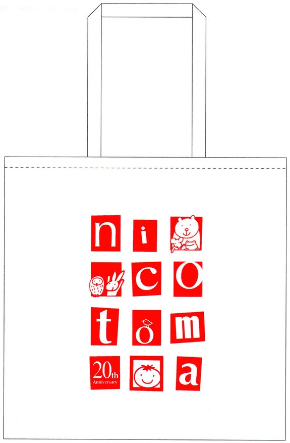 にこトマのマークを考案したグラフィックデザイナー(元メンバー)に、20周年記念のトートバッグをデザインしていただきました。制作途中のため、現在はこんな感じです。一部変更の場合もあります。完成を楽しみにしていてください。