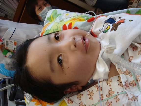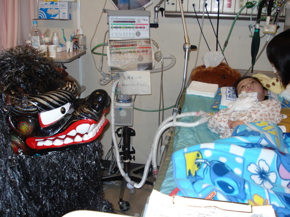 もう一枚の写真は、ベッドまで沖縄のお獅子が来てくれた時のものです。沖縄の獅子舞を見せてもらいました!