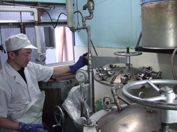 大きな回転式蒸気釜で約1時間ほど時間をかけて蒸していきます。