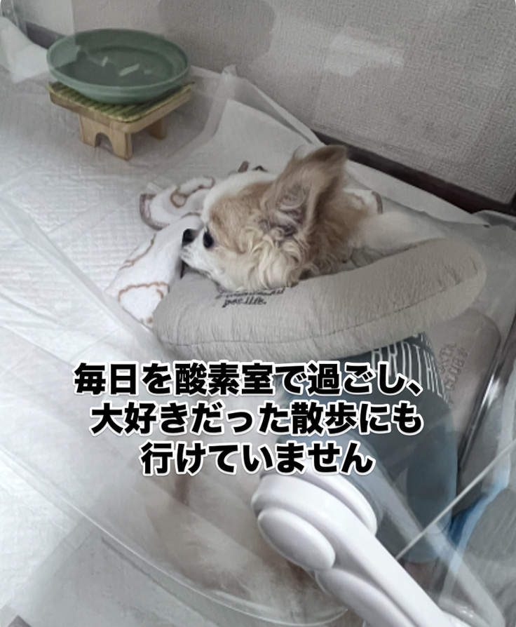 毎日酸素室に入っていることでニーノを抱きしめてあげることが減り、仕事の合間もペットカメラでニーノの様子を見守り、夜は発作を起こさないかとニーノの酸素室横にクッションを敷いて寝る日々です。