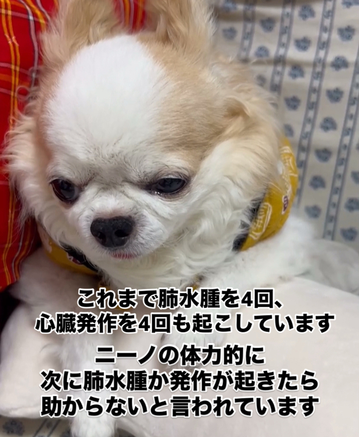 ニーノも小さな身体で我々の必死の治療に応えてくれて、現在まで4回の肺水腫と4回の心臓発作という苦難をなんとか乗り越えてくれました。