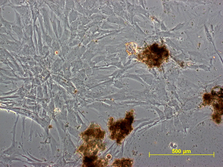 増えたての培養細胞、茶色の部分はトゲネズミの筋組織の断片です。