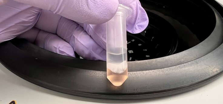 チューブの中が3層に分かれているのが見えますか?一番上の上澄みに取り出したDNAがたっぷり入っています。ただの透明な液体に見えますが、その中には生物のすべてを決める情報が詰まっているなんて不思議ですね。