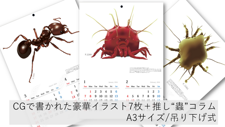 お届けは2023年中ですので、来年のお正月から「CGで書かれた豪華イラスト7枚+推し”蟲”コラム」を1年お楽しみいただけます。A3サイズ吊り下げ式で、お好きなところに飾っていただける使い勝手の良いサイズ感です。