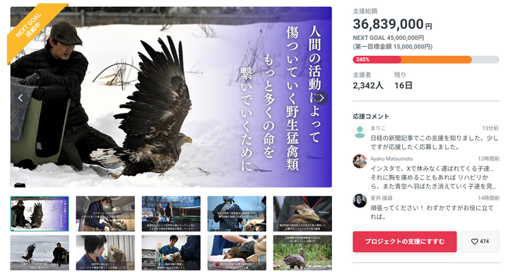 猛禽類医学研究所では2月29日(木)午後11:00までREADYFORにてクラウドファンディングに挑戦されています。こちらもご支援よろしくお願いいたします!