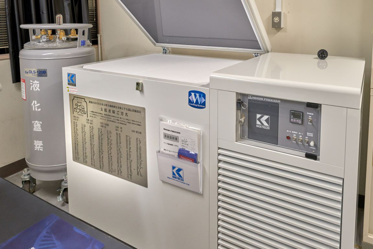 こちらが今回のクラウドファンディングで購入・設置を行いました、細胞長期保存用機器になります。電源を使う「フリーズ超低温槽」と呼ばれるもので、マイナス150℃で安定的に絶滅危惧種細胞の長期保存が可能です。横には停電に備えた液体窒素のタンクも常備、安心のバックアップ体制が組まれています。