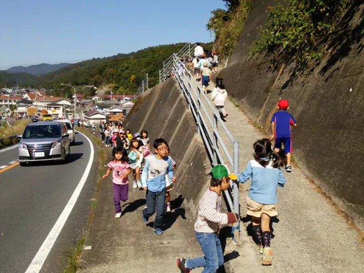 整備後も、避難訓練での「高齢者には階段がきつい、手すりが無いと登れない」等の意見を反映し、階段の勾配やステップの高さ等標準的な構造基準を設け、手すりを兼ねた防護柵を設置するなど、子供からお年寄りまで安全に利用できる構造に改善しています。また、避難道の起終点には夜間照明の設置、避難経路には避難誘導灯(緑点灯)を設置することで、夜間避難にも対応しています。計画された避難場所約160箇所、避難道213路線は、令和3年度に全て完成。また、津波の到達予測時間内に高台へ避難することが計算上不可能な「避難困難区域」を明確にし、その区域の解消を目的に津波避難タワーを町内で6基整備しています。平成29年3月末に完成した佐賀地区津波避難タワーは、海抜25.4m、収容人数230人を誇り、世界最大です(2024年10月現在)。