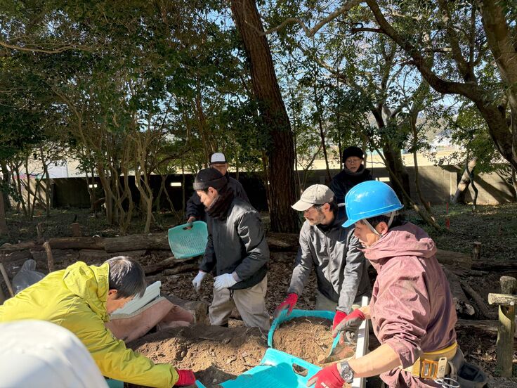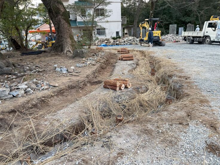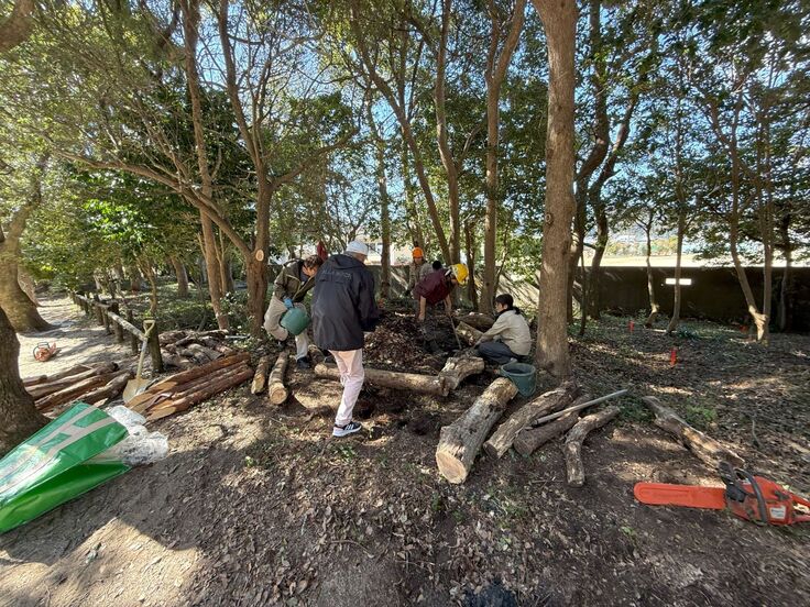 地球守の皆様の指示のもと、町内からのボランティアの皆様も重機の運転、さらには「しがら(マウント)」の作成など、今回の土中環境改善の施工に取り組みます