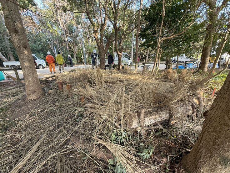 この土中環境のキモとなる溝掘り・杭打ちが完了。さらにはマウント(しがら)も3箇所完成で1日目の作業終了です