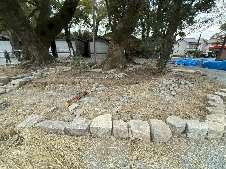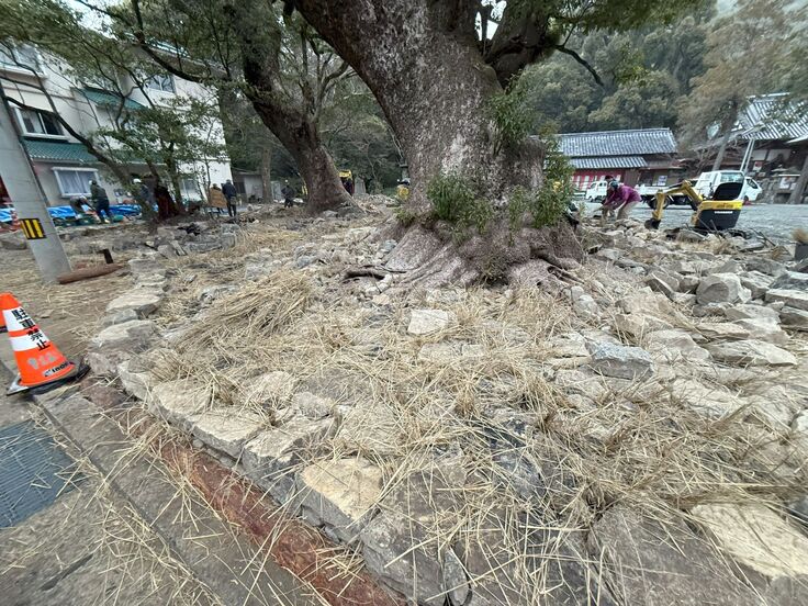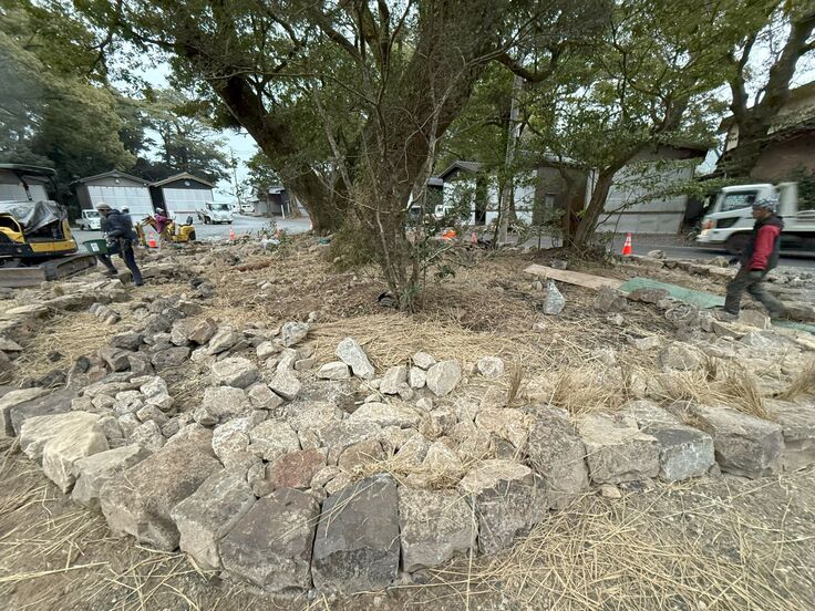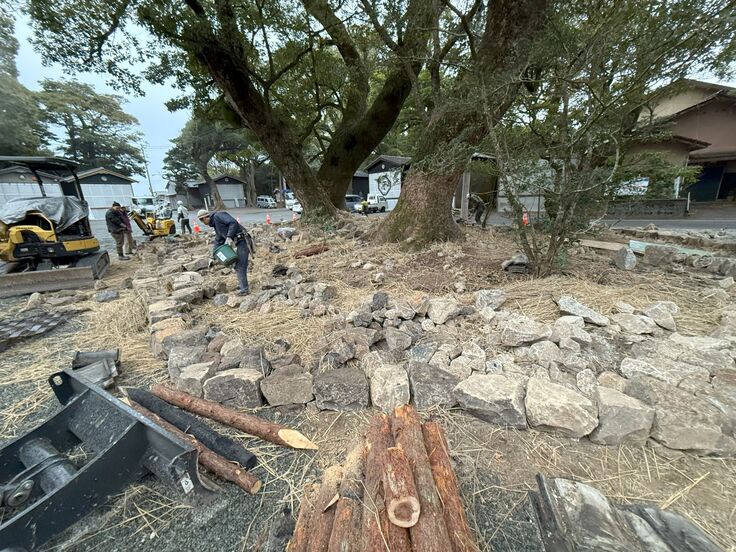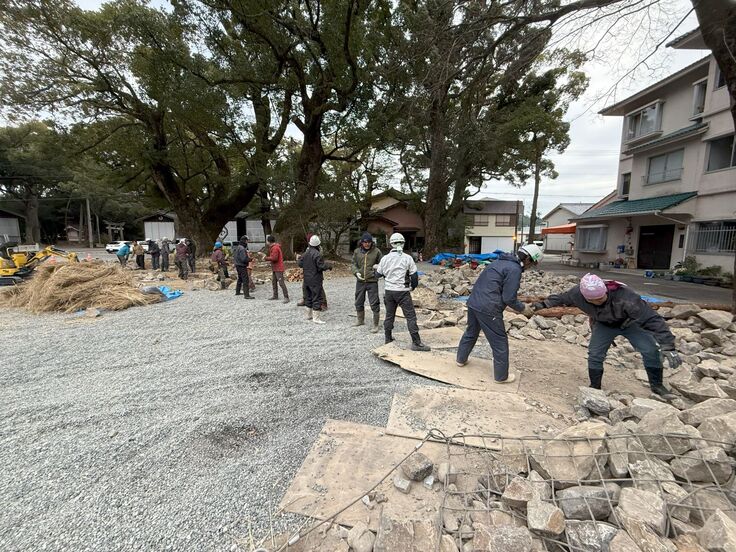 今回の施工では、町内の建設業者様から応援があり、石の運搬はすべてここまで重機で行っておりましたが、本日はNPO法人地球守様の伝家の宝刀石運びリレーでまずはウォーミングアップを兼ねて石を現場に運びます!