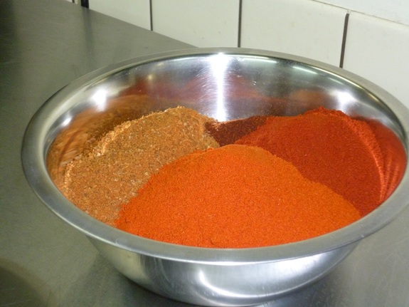 先ず、肉とスパイス、氷の入った撹拌器を回します。肉が細かく粗挽きになっていきます。