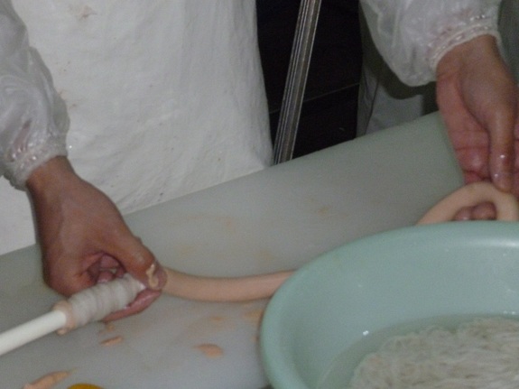 次に羊の腸を水で戻し、そこに詰めていきます。スルスルっと腸詰めされ、それを同じ長さにねじります。