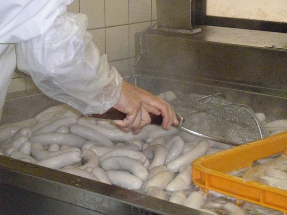 また、ボイルしたてを食べさせてもらいました。スモークされたのとは違う、パリッとした中はきめ細かい滑らかな触感のソーセージです。