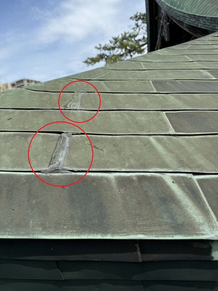 複数個所で屋根銅板に亀裂が入っているようです。