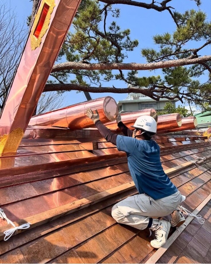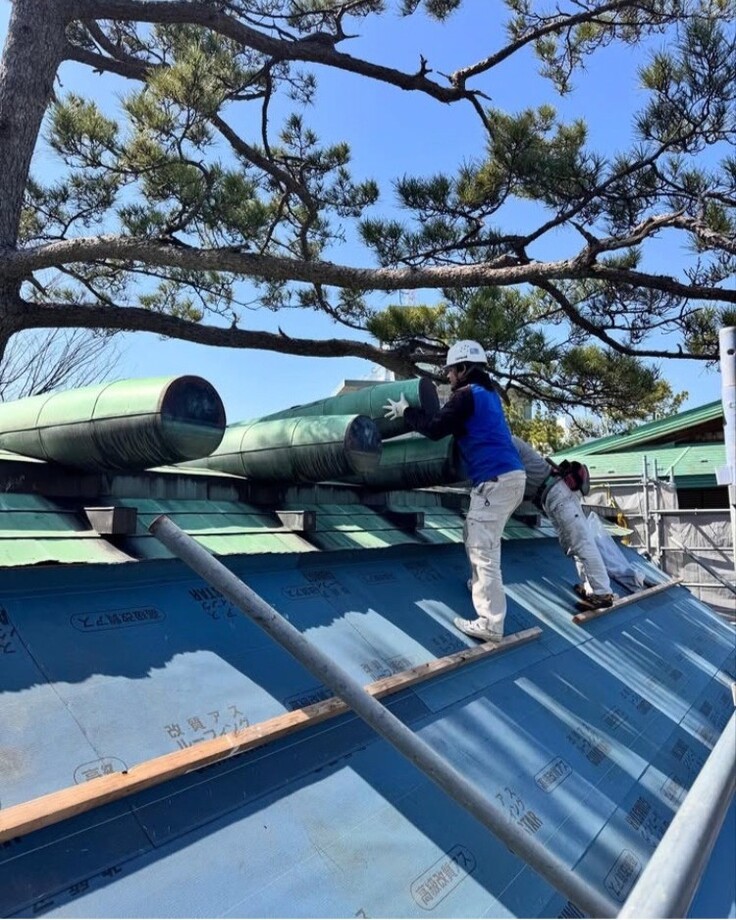 現在、御稲御倉の屋根張り替え工事が進み、ピカピカの屋根に変わっています。千木(ちぎ)鰹木(かつおぎ)が付けられ、飾り金具も磨かれピカピカです。5月31日までの予定で屋根の張り替え工事を行います。