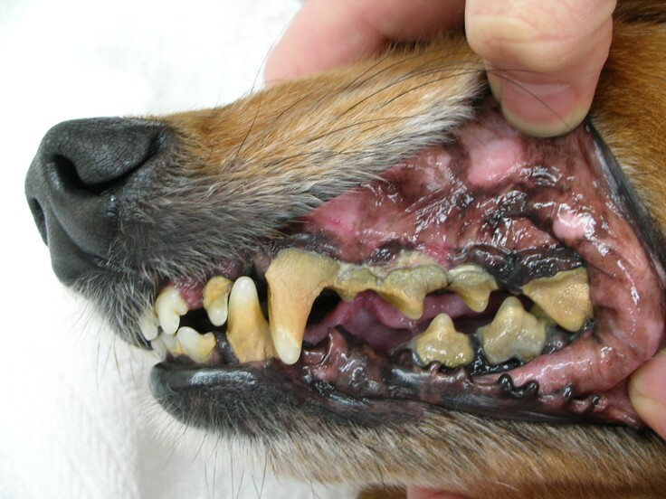 まず、下記の柴犬の歯垢・歯石がたくさんついた写真をご覧になってください。