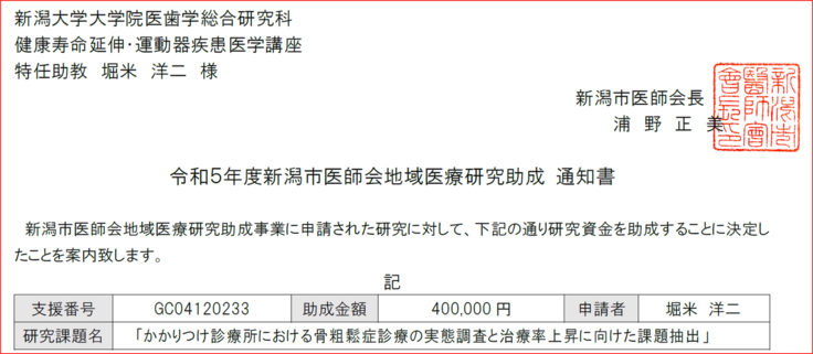 この度、実行者の堀米は、本プロジェクトとは別に、新潟市医師会地域医療研究助成を頂けることになりました。