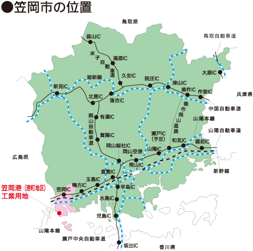 笠岡市は岡山県の西端、広島県との県境に位置しています。
