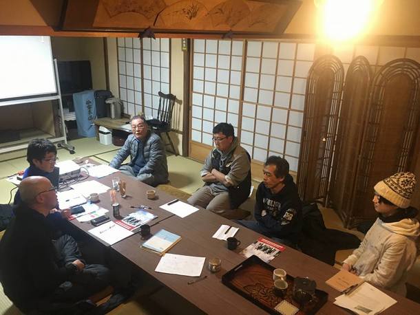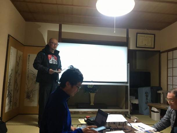 日曜日の草刈り後には会合を行いました!新山には新栄会以外にも、「新山食堂」という地域食堂(毎月1日と15日の二日のみ、地域の方向けに営業)や地域おこし協力隊、古民家カフェ・交流拠点の「庄屋屋敷とくら」など、様々な地域活動をしている団体があります。今回は、それぞれの活動の紹介や、「エレベータートーク」という方法で思いや活動内容をわかりやすく、短く伝える練習をしました!