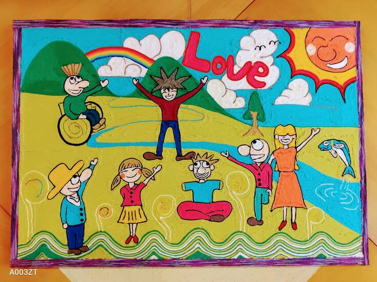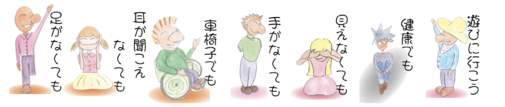 脚が無かったり、手が無かったり目が見えなかったり…、どこかに、しょうがいがあってもお互いに声を掛け合い、補い合って、楽しそうにしている姿が表現され、しょうがい者と健常者が心の隔たりなく生きる上での大切ななメッセージが込められた物語です。