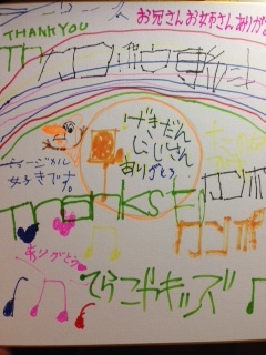 今日は2月最初の公演を川崎で行ってきました。久々の遠征で、みんな緊張していましたが、なんとかいつも通りの演技をすることができました。最後には子供たちから色紙の贈呈があり、団員一同嬉しさをこらえきれませんでした。公演後には子供たちと、目一杯遊び、子供たちのエネルギーがやはり凄まじいものだということを、再認識しました。彼らのパワーは私たちに元気をくれました。
