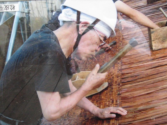 (かなづち、通称:やねかな ※屋根屋さんが使う金槌は特殊な形をしているから):釘は、竹釘を使用。竹釘の片側は斜め、反対側は垂直になっている。