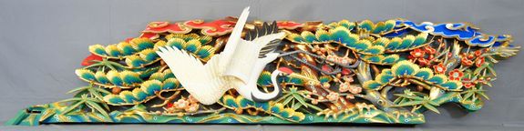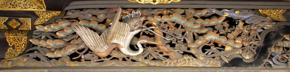 この写真は、唐門の欄間彫刻「松竹梅に鶴と亀」の修復ビフォア・アフターです。