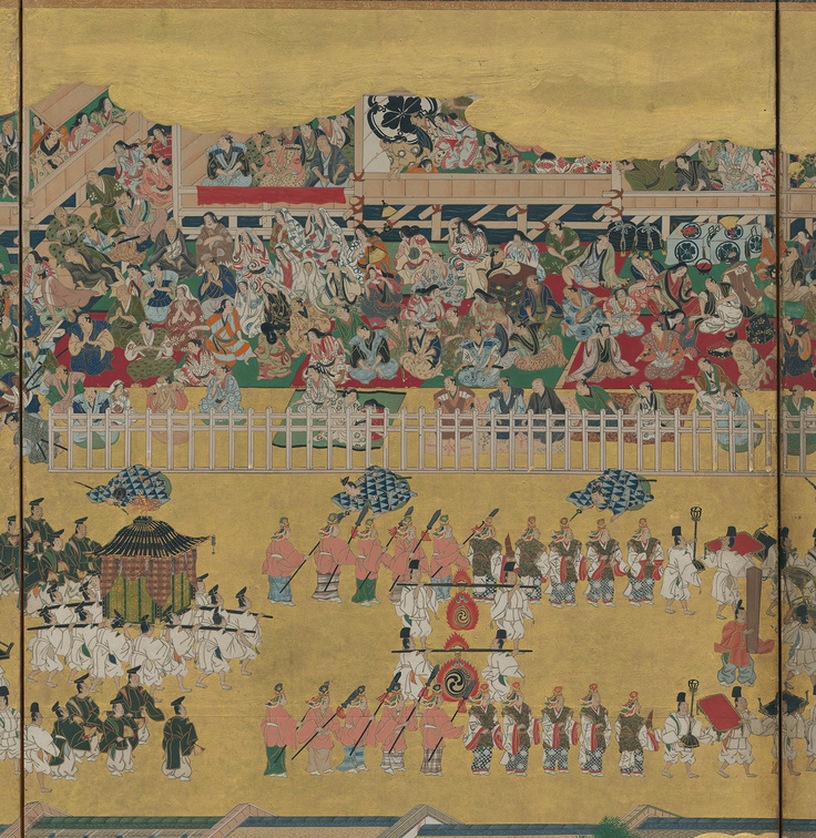 当時の将軍・徳川家光の招きにより、「寛永文化を花開かせた中心人物」と言われる第108代天皇 後水尾天皇を中心に、御所から二条城まで9000人を超える空前絶後の大パレードが行われました。朝廷と幕府方が勢揃いし公武の融和が生まれただけでなく、沿道には日本各地から老若男女・身分を問わずさまざまな人々が詰め寄り、着飾り浮かれ騒ぐなど、異様ながら華々しく歴史的な出来事だったことが、「二条城行幸図屏風」からわかります。