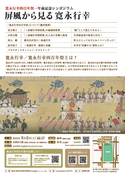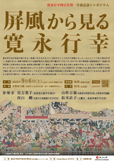 1626年9月に行われた「寛永行幸」まであと、399年。四百年祭を来年に控え、2025年9月6日(土)、シンポジウムを開催いたします。寛永行幸の様子を詳細に表した「二条城行幸図屏風」。こちらをさまざまな専門家の方に読み解いていただきます。ぜひお越しください!