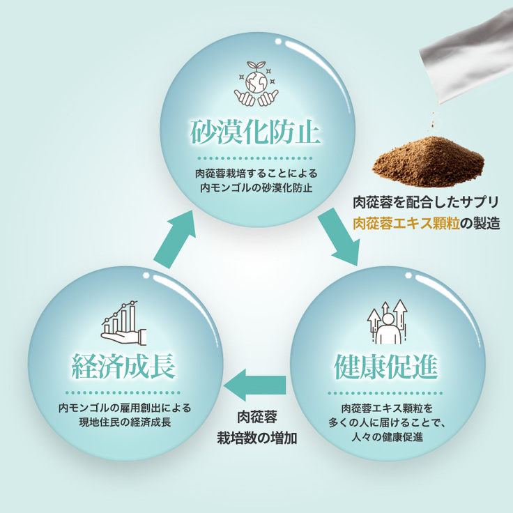 このプロジェクトは内モンゴルで栽培される植物「肉蓯蓉」を配合した健康食品「肉蓯蓉エキス顆粒」の開発による、内モンゴルの砂漠化防止と経済発展、人々の健康を循環させていく社会の構築を目指します。