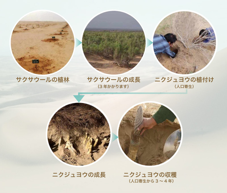 環境の厳しい内モンゴルのアラシャン・チャンカンシ地区では、日常食としてニクジュヨウと羊肉の煮込み自家製のニクジュヨウ酒をよく食されており、アラシャン・チャンカンシ地区の健康を長年支えてきた植物です。