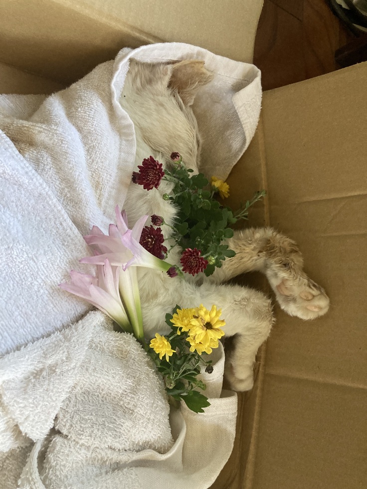 近所の動物好きさんが庭の花をつんで持って来てくれました。時間がなくお花の準備が出来なかったし、優しい気持ちとお花がすごく嬉しかったです。