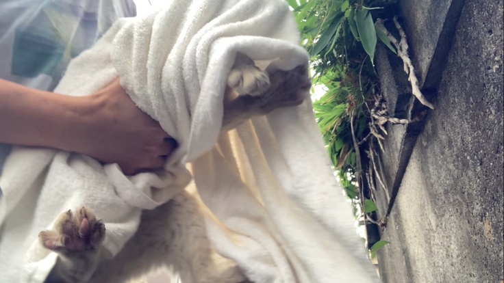 近所の家に来ていたシャーくんが2週間ぶりに姿を見せて、フラフラしながら歩いていて、保護しようとしたら溝に落ちたとのこと。急いで行ってバスタオルで包み保護しました。