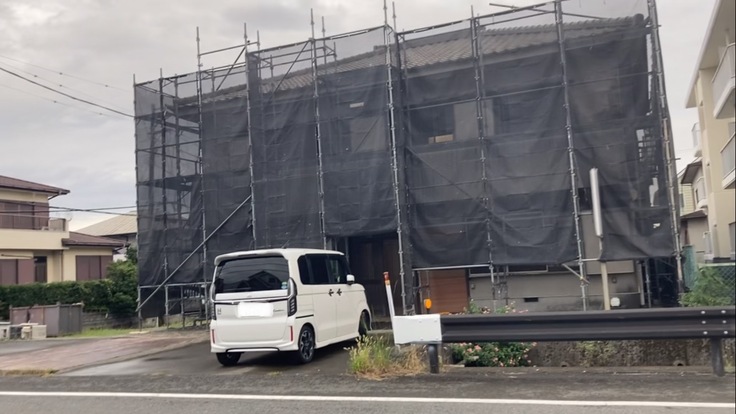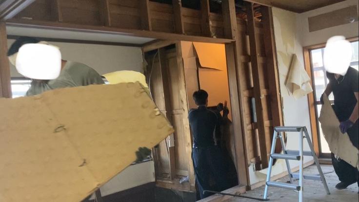 現在は室内一部解体工事、給排水工事、外回りは足場を掛け壊れていた雨樋や不要な配線・配管撤去、2階の第1次電気工事、2階和室の畳を取り除き床壁の下地工事、1階内装の解体工事などが終わりました。