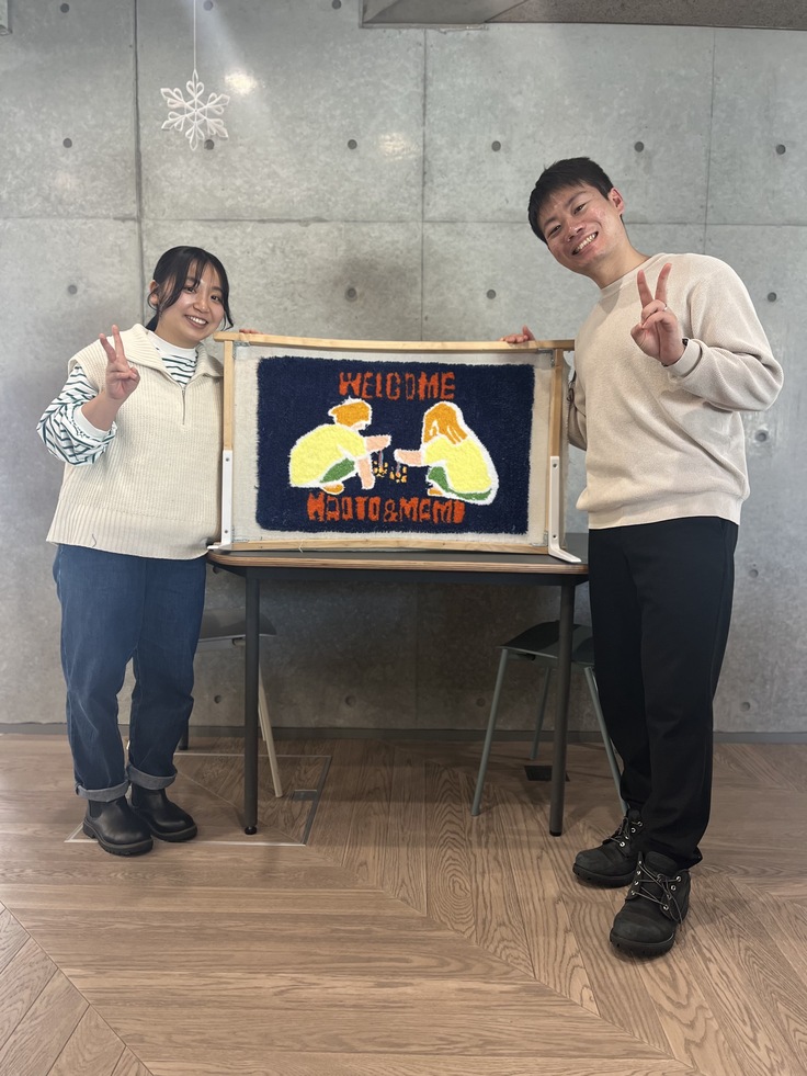 ラグ作りの技法のひとつで、専用の機械を使用しピンと張った布に対して、糸を打ち込んでいきます。体験は、打ち込みまでとなりそこから裏面・表面の仕上げをし後日お渡しとなります。