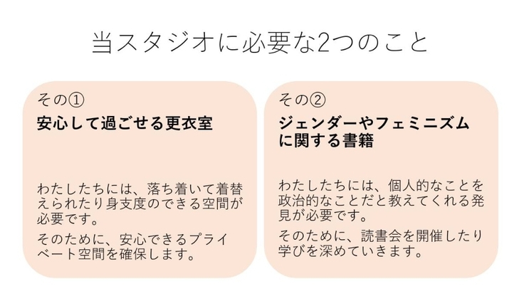 ここから生まれるプロジェクトは、本当は必要なのに今までなかった、がんばらないトレーニングスタジオです。「細い」=「きれい・かわいい」といった幻想を押し付けることはありません。