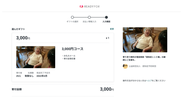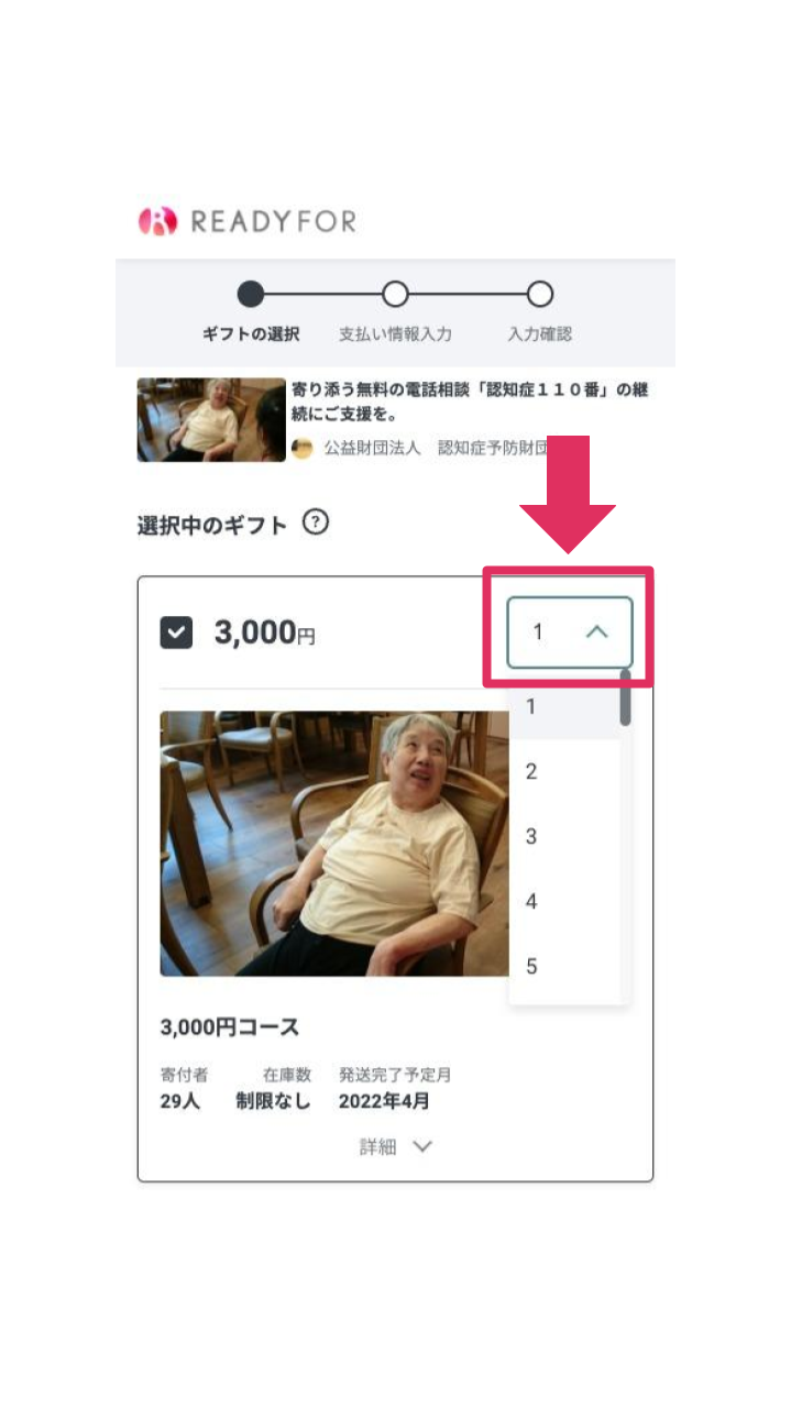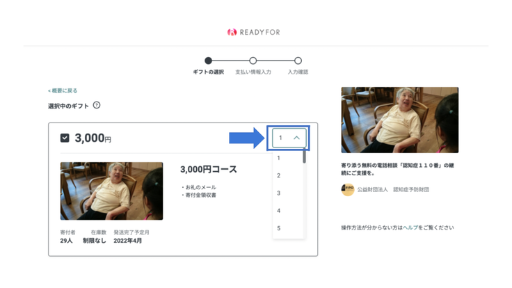 ログイン後、支援内容に間違いがないか確認し、ギフト個数を選ぶ