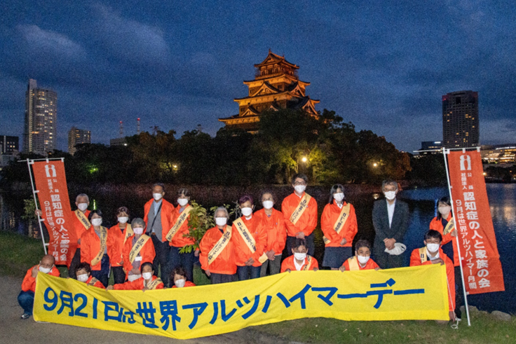 世界アルツハイマーデーの夜、全国のタワーやお城などが認知症支援の色、オレンジにライトアップされ、22カ所の中継地点を結び、配信しました。