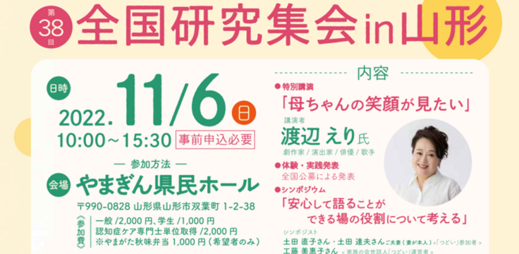 内容は、劇作家/演出家/俳優/歌手の渡辺えりさんの「母ちゃんの笑顔が見たい」と題した特別講演、全国公募による体験・発表、シンポジウムなど、充実しています。