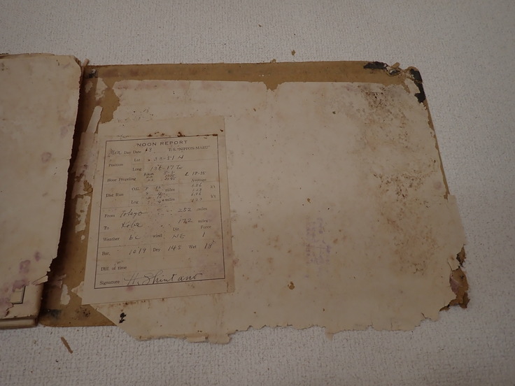 多くの船員を養成した練習帆船「日本丸」、現在は国の重要文化財として横浜の日本丸メモリアルパークで保存公開されていますが、その帆船「日本丸」の、損傷が激しくなった「無線日誌」を是非とも修復したい、とのお話を伺いました。「無線日誌」は、僚船の位置や行動の確認、他船の事故、各種演習、台風等の情報や国際電話の依頼など、日々の様々な情報が記されていてまことに興味深いものと伺っています。 是非、適切な修復・保存が行われ、「日本丸」と共に、海や船の文化として次の世代に継承していただければと思います。