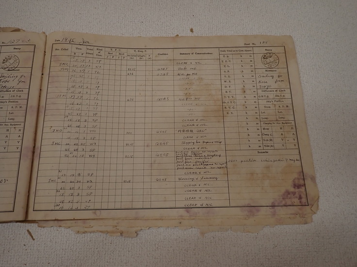 こちらの無線日誌は修復を行う予定のものです。横型で、大きさはおよそタテ30㎝×ヨコ40㎝です。日本丸の無線日誌にはタテ型のものもあります。他の無線日誌の多くには表紙に表題紙がついていますが、こちらの無線日誌からははずれ、表題紙そのものは日誌のなかに挟み込まれた状態で残されています。