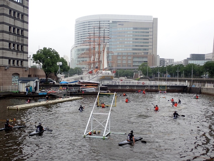 この日は帆船日本丸の近くのシーカヤックパークで、カヌーポロ大会が開催されていました。雨の中、熱戦が繰り広げられていました!!