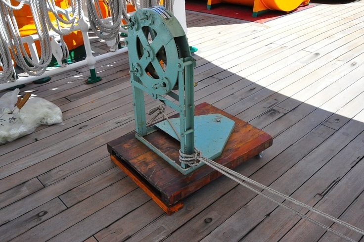 日本丸にある、ロープをつくる道具です。「縄うち機」といい、二つ一組でロープをつくります。