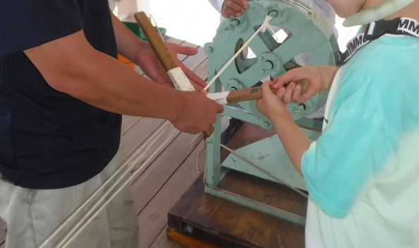 次の写真は、「縄うち機」と「なこうど」を使っている様子です。「なこうど」を使って子縄(ストランド)を均一によって、ロープをつくります。
