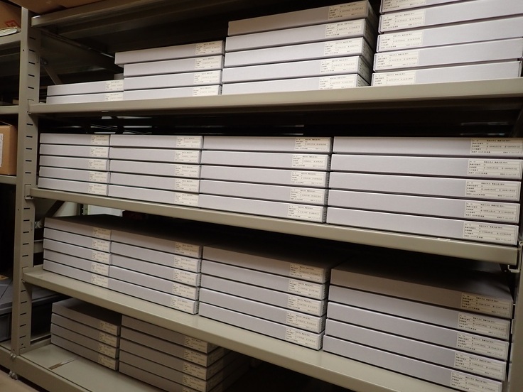 博物館収蔵庫に収められた無線日誌用の中性紙製の保存箱です。箱の中に1冊ずつ帆船日本丸の無線日誌が入っています。